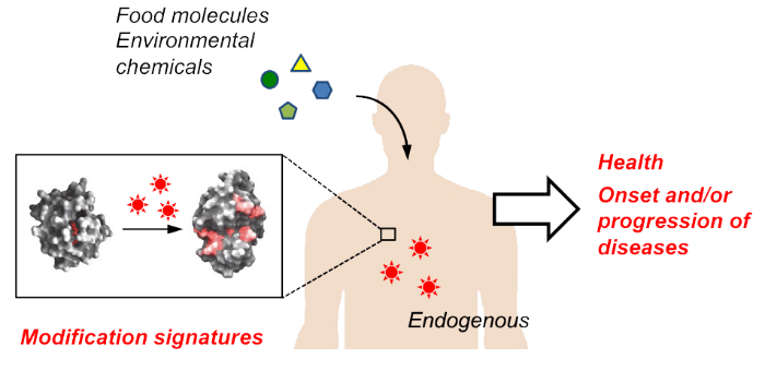 例えば、酸素とブドウ糖という生存に必要不可欠な分子は、自然修飾をもたらす重要な因子です。酸素はもともとビラジカルという活性化されやすい状態にある分子で、様々な酸素活性種の起源であるとともに、脂肪酸の過酸化におけるフリーラジカル連鎖反応でも重要な役割を果たします。また、ブドウ糖を含む還元糖はそのアルデヒド性のためタンパク質などの生体成分と反応性を示します。