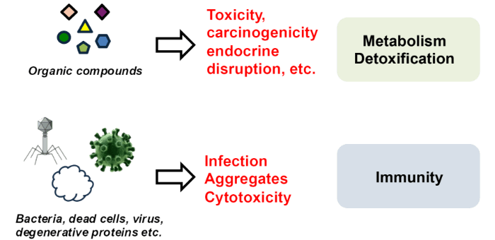 また、三次機能に関連した食品成分は応用(製品化)が優先されがちで、その本質的な機能や分子メカニズムの解明がおろそかになっているものが多いのも否めません。当研究室では、ポリフェノールや含硫化合物など、本来は植物にとって創傷治癒や生体防御などに働いている代謝物のアンチエイジング機能に興味を持っています。特に、生まれながらにして備わっている解毒や免疫などの「生体防御機能」に食品成分がどう働くのか、と言った視点に基づいた研究を推進しています。